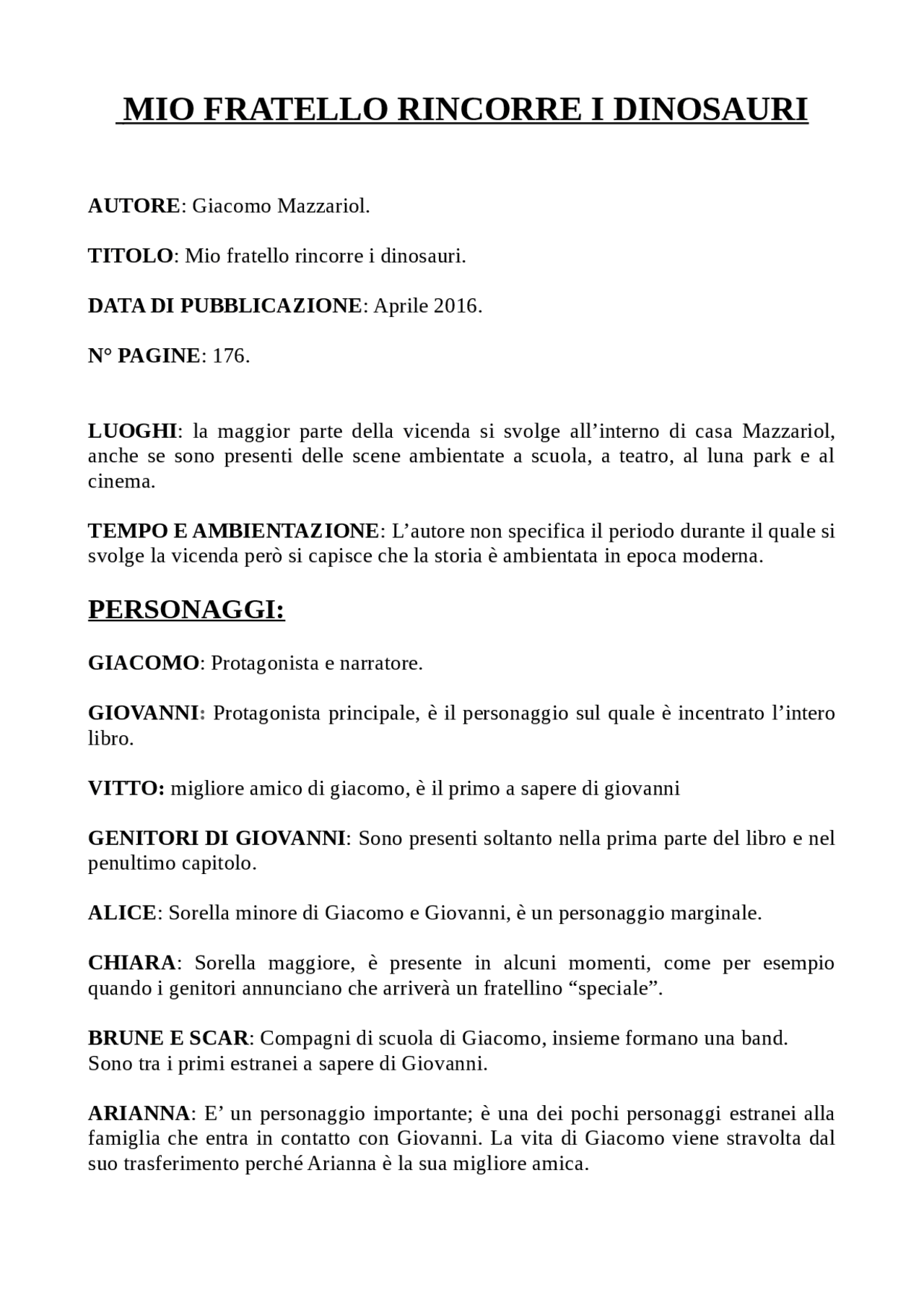 Trama. Giacomo "Jack" è un bambino che vive a Pieve di Cento, con i genitori Davide e Katia e le sorelle maggiori Chiara e Alice. Un giorno riceve la notizia che presto avrà un fratello, che si chiamerà Giovanni (Giò). Alla nascita del fratellino, Jack e la sua famiglia scoprono che Giovanni ha la sindrome di Down.. Mio fratello rincorre i dinosauri di Giacomo Mazzariol. Dopo aver letto con attenzione il romanzo e dopo aver sottolineato a matita o evidenziato con un post-it i brani che ti sono maggiormente piaciuti e che ritieni più importanti, rispondi alle seguenti domande in forma scritta, anche rileggendo le pagine indicate. Capitolo 1, "Annunciazione":